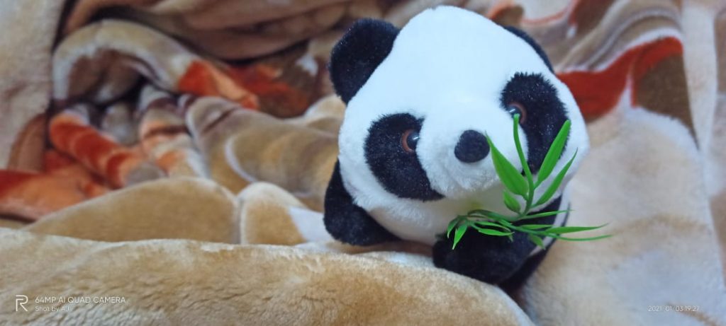Meet this little panda. He keeps eating this grass. I think he must be hungry. None of the other toy seems to be eating anything.